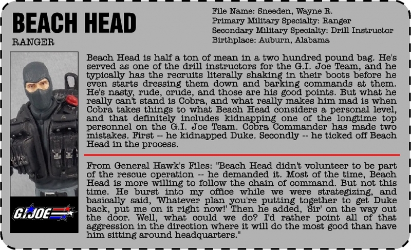When we changed to GI Joe Resurgence, a Battle Corps version didn't really work anymore, so I updated the recipe to something more ''Beachheady'', but I kept the original Urban Ops color scheme.