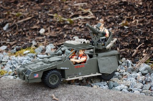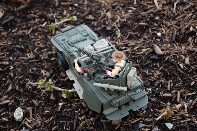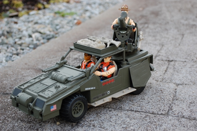 I always thought of Slaughters Marauders as the Joes version of the Dreadnoks. The Slobberknocker is supposed to be built from the destroyed Thunder Machine. This wasn't an easy custom to build as I wanted it to have kind of that Mad Max feel but still look like it could be a GI JOE vehicle. I lowered the roll cage down to give it a bit different look from the Thunder Machine. I also scratch built fenders and headlights and a roof rack that can come off. I used an extra Transformer gun for the rear gun to go with the Noks trike bike cannon turret. I went with a flat olive drab and tan to finish it off.
