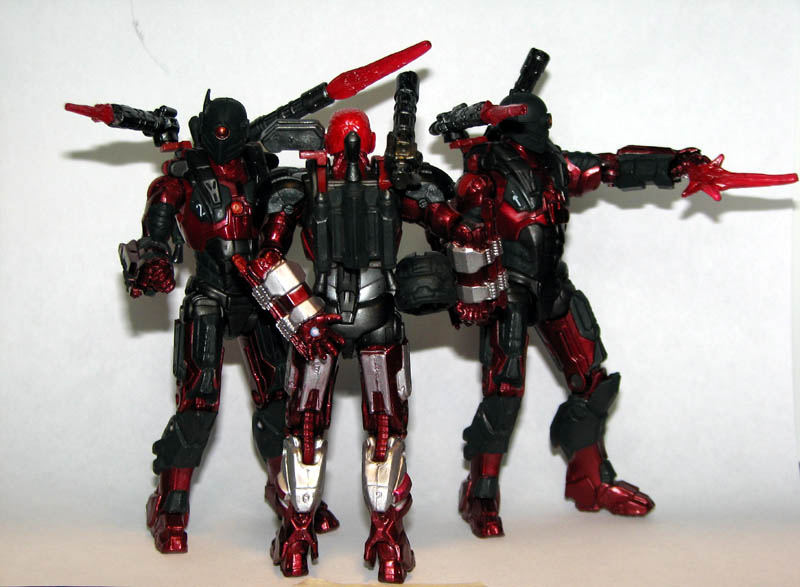 After seeing the other Red Laser customs I knew I had to do one for myself. After tossing the idea around for a bit I decided on making 3 figures, 2 'bots and a "self custom" of sorts. Using the IM2 War Machine body gave me the armored soldier/robot feel I wanted for these. I painted over the sloppy silver accents on the 2 'bots but left the silver on my figure so it would be more distinguishable as the leader. I have been sitting on that red cast of my headsculpt for a few years, not knowing what I could do with it. When this project came up I had the perfect use for it - a Red Laser clone of myself. A little clear red paint for the eyes and hair and my clone me was ready for combat. I had to include the Boba Fett jetpacks as jetpacks seem to be an identifying trademark of the Red Lasers. Plus it helped tone down some of the "War Machine" vibe of the base figure. I also used the Retaliation Combat Ninja alt head for the 'bots to tie them in with the other Red Lasers that have been done.
