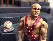 One of my side projects has been to take some figures with sculpted on helmets and give them new heads and make their original heads into removable helmets. I think that I found a great head for an unmasked Big Boa. I have no idea who the wrestler is, but the rage face really fits how I've characterized Big Boa in my universe: as the most angry man on Cobra Island. Hollowing out the helmet was a lot of work, and it's pretty thin in some places to get a good fit.