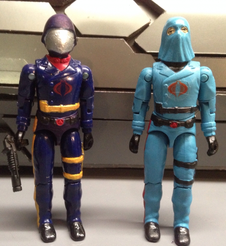 Ever since I learned of the possibility of getting parts chromed up, I wanted to get a v1 Cobra Commander head done. Now, a million years later, and with the help of my good friend Joemichaels70, I got this guy done. I ended up repainting him pretty much head to toe, because I couldn't quite match the original blue, plus the arms had a little sun damage, making them that weird turquoise color. I tried to work around the Cobra, but ended up painting it over and using a sticker.