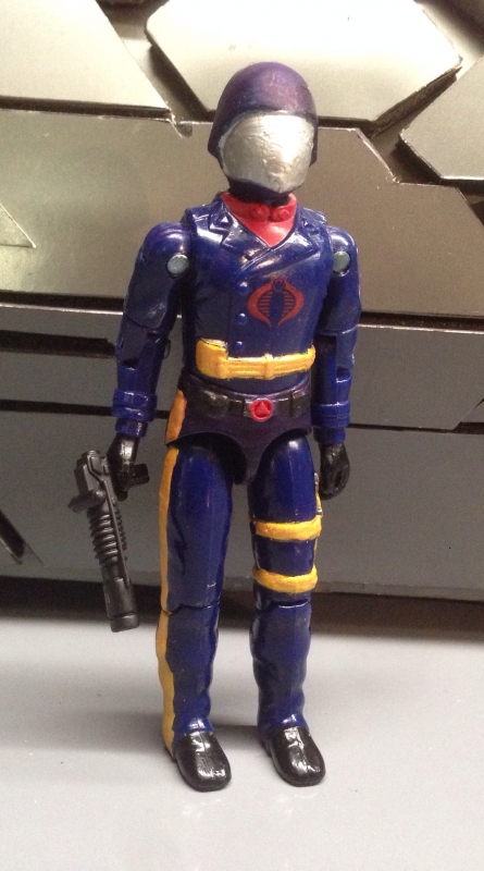 I had a handful of early Cobra Commander parts in various states of disrepair. I thought it might be fun to switch the colors and put v1 in dark blue, and v2 in light blue. I wish I'd thought to get both helmet heads chromed up. This figure actually uses the light blue waist piece, since the dark blue one was broken. I had to repaint the gold trim, which was a pain, until I threw down a coat of yellow, then painted the gold over the top of it.