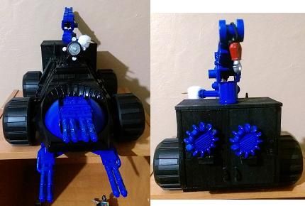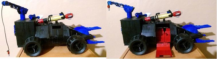 Vehicle: Cobra Slither (because it slithers in and around the zoids) D.R.V. (delivery and retrieval vehicle). I made this out of a old Parasite. I needed a troop transport to get the guys, tools, and what not out to the Zoids and this fits everyone in. I modified the side door so it has a ramp. On the other side I added a door and ramp after cutting off the part where the mines were stored because I didn't want the guys having to climb over the seats to get out. The mines I relocated to the back of the tool shed to use as gears for the Zoids. I relocated the gun to the top of the shed as well as adding a crane from the Battle Platform to help with working on the Zoids. And on top I stuck a sonic screw driver as a cannon for extra fire power.