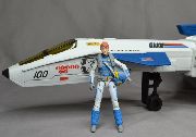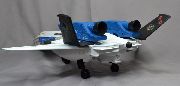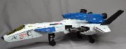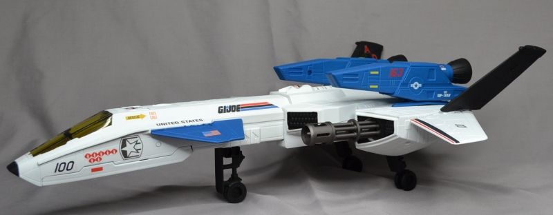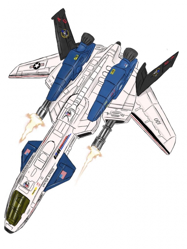 "This exo-atmospheric fighter will crush COBRA! Using sophisticated stealth technology, the Thunderstriker cannot be detected by radar as it attacks COBRA's lunar base! Features advanced forward-swept wing design, retractable landing gear, air-to ground missiles, rocket boosters, dual vulcan canons, opening cockpit, and more! Includes pilot STRAFE."