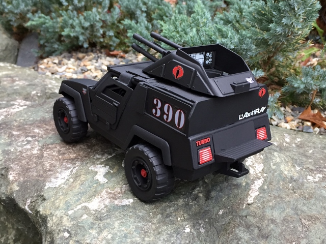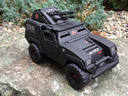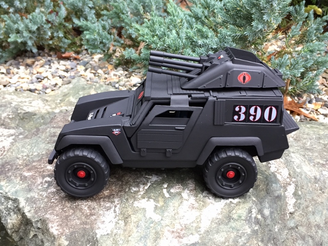 Cobra Commander ordered his vehicle design team to build a newer more effective version of the Stinger Jeep. They started with the same basic jeep and added a four barrel 30mm cannon. The vehicles body panels were then replaced with I higher grade military steel and armor plating around the windows to protect the driver. I also has a much bigger front bumper and a more compact rear step. To finish it off a wider set of wheels with blast proof tires were added.