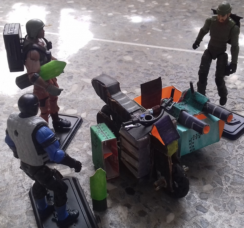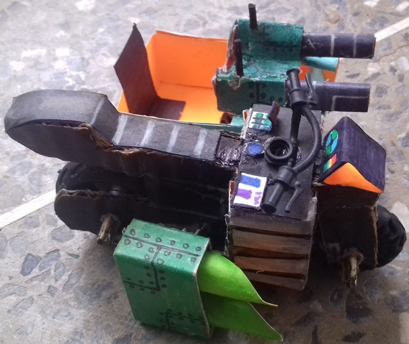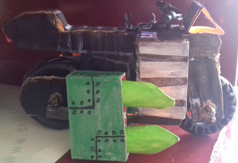Made entirely from Bristol board, Card board, match sticks, acrylic paint, markers, sharpie, x-acto blade, scissors and my trusty glue gun. Wheels and handle from an old toy motorcycle.
