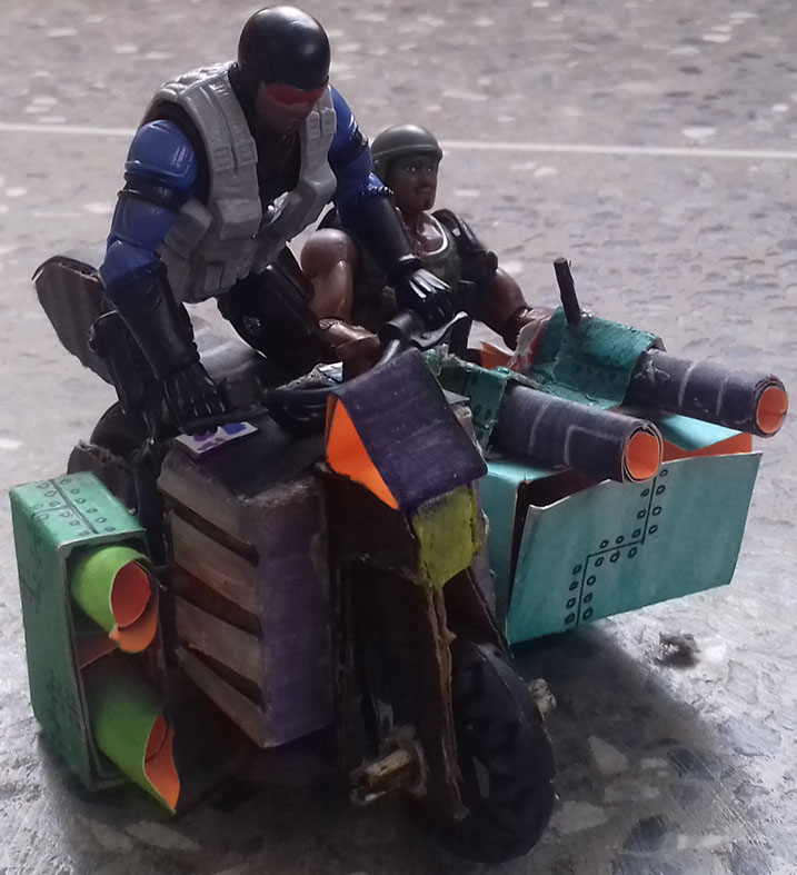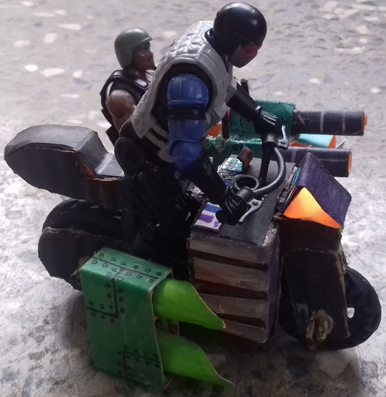 The Archer is the G.I. Joe S.T.A.G team's scout assault cycle. The S.A.C has a 900cc supercharged engine which produces 150hp and capable of reaching speeds of 115kph with full armaments and personnel. The Archer is equipped with 2 anti-tank smart missiles and on the sidecar a 20 calibre dual laser canon.