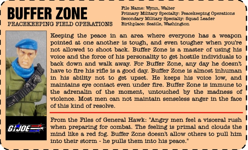 If Peacemaker is the dove, Buffer Zone is the hawk. He was the second member and the commander of the team. I tried to create a look that stayed true to the spirit of the original Steel Brigade figure. I gave him the traditional colors, kneepads, the bandolier and an SBD helmet. Of the five members of the team, I tried to make Buffer Zone the most realistic military. He has the least amount of blue, wears the heavy field jacket and has the most ''grounded'' accessories. Filecard by Raptor and GITrekker.