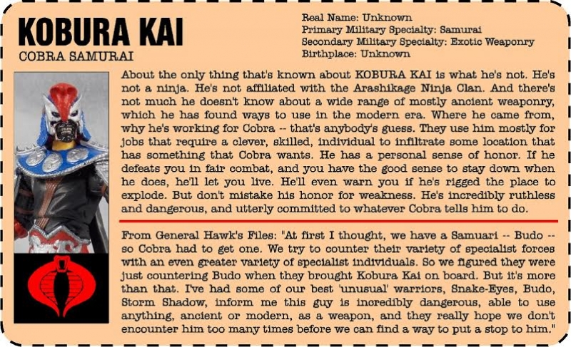 Early in the winter prior to Resurgence 2, I was trying to think of some specialty type that Cobra didn't have. I couldn't think of much. While browsing my figures, I came across the samurai Destro that Joemichaels70 made for me during a contest a couple of years back. Cobra didn't have a samurai, so I contemplated ripping up the custom and making one. I didn't want too at first, but I could not resist doing it. Between the Budo base and the samurai parts from a marvel figure, it came together quickly. I chose the name as a reference to the 80's karate kid movies.