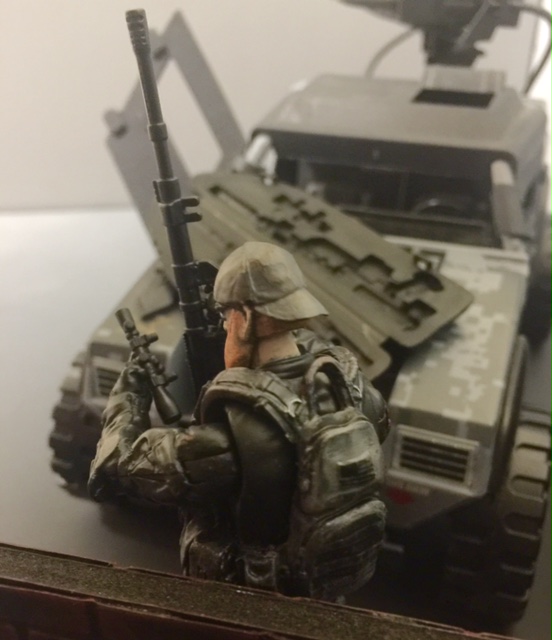 It can't snow all the time. I'm a big fan of the Pursuit of Cobra line, specifically the City Strike figures. I wanted to add to it and was inspired by a head included in a fifty pack grab bag from Star Wars Geek. I highly recommend picking one up when they are available, they'll really open your eyes to customs you haven't thought of. I sculpted a burlier beard on the head to more resemble Snowjob. I took the web gear from Night Fox included with the Ninja Combat Cruiser and carved out the inside and added a section to make it fit around a multi-POA figure. I painted the pants in a digital urban camo using a frayed short bristled brush, and painted the subdued flag on the back pack.