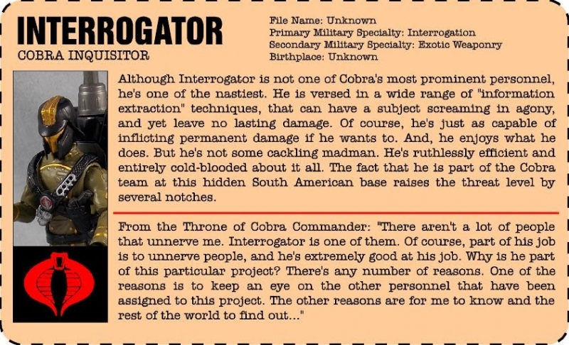 Once we decided to spin off Mission Brazil from Resurgence 3, we wanted to create a Cobra 7-Pack. We started brainstorming about possible team members. I had a WIP build of the Interrogator since 2013. Originally, I was going to include him in my Battle Corps Month project. He did not make the cut at the time, so I dusted off the figure and re-thought the color scheme. Since we were creating a unified color pallet for the team, he needed to fit in but be different at the same time. For some reason, I felt that a khaki uniform, inspired by my Eagle Force General Mamba custom, worked for the character so I started there. I decided to include the Battle Copter accessory as homage to the original figure.