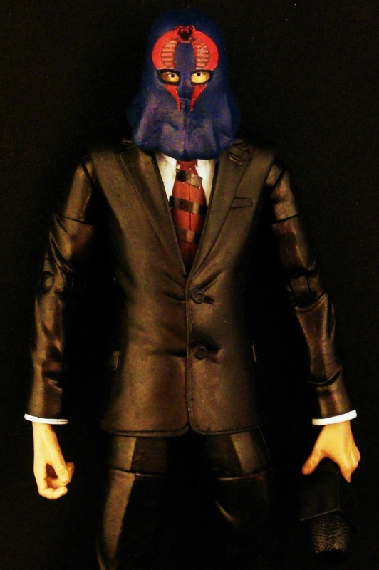 Used a marvel legends as a base. COBRA SUPREME LEADER BLACK SUIT HOODED COBRA COMMANDER based on the GI JOE 25th anniversary series Marvel Legends style in a 6" Inch 1:12th Scale.