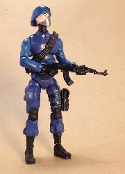 To help guard Cobra Commander in a high density area, standard Cobra Troopers aren't quite enough. The Parade Dress Division are outfitted with a malleable Kevlar that stops small arms fire and slows blade attacks. Add to that the half mask that may look stylish but gives constant electronic threat assessments and you have a class of soldiers who are quite efficient at guard duty. Even if they are too expensive for the field, they make a great recruitment tactic.