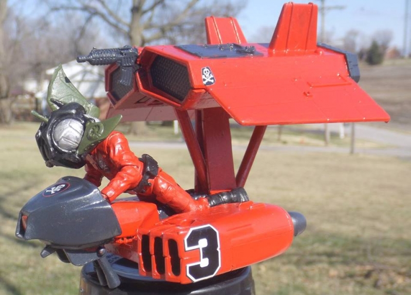 The bike has dual main jets as well as dual directional thrusters which serve to both add an extra boost of speed as well as help it handle the corners. It also has a small dual upwards thruster. The Shadow Cycle is not the fastest thing on the track but it isn't slow.