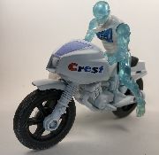 The Fluorider is a fast attack motorcycle used by the Crest Team to engage the Cavity Creeps anywhere in Toothopolis at a moment's notice. Armed with a fluoride cannon mounted on the side, the Fluorider is usually first on the scene when the Cavity Creeps attack. The mysterious artificial life form Gel is usually the driver of the Fluorider, who's unique physiology is ideally suited for operating it at high speeds.