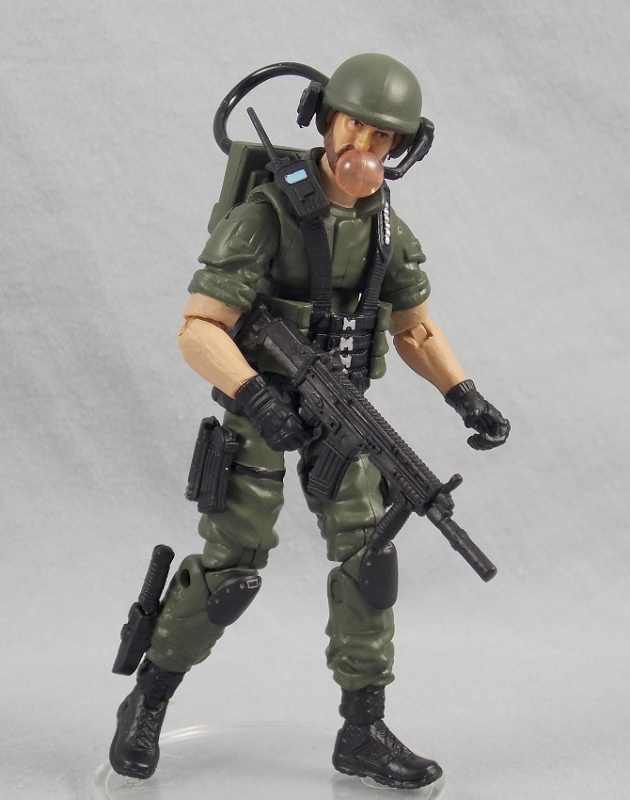 I can't take any credit for this custom. A few years ago at New Jersey Comic Con, Boss Fight Studios showed off some awesome custom GI Joe figures. One of those figures was a modern take on Breaker, GI Joe's original communications specialist. Their version was a great mix of vintage (headset) and modern (vest, armour) elements. I changed some parts from their version according to what I had in my fodder box.