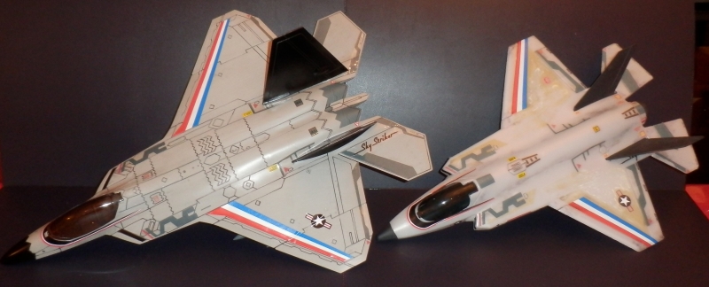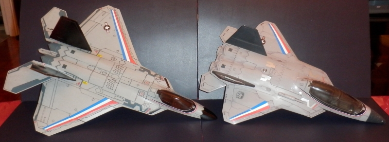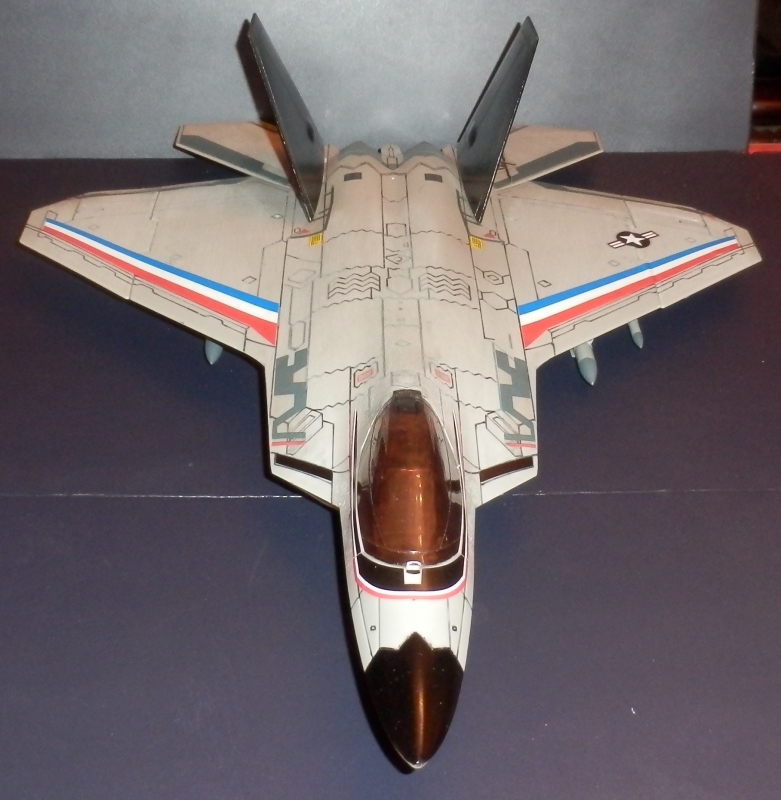 I've always hesitated about getting this True Heroes version of the F-22, but one came up on ebay for a good price and I couldn't pass up. The key thing that always made me hesitate was that although I always thought it would be a nice and much more realistic looking/proportionate companion to the American Plastic Toys F-35, I didn't have the confidence to either repaint the entire jet or remove the camoflage gray paint it originally came in. Turns out it was dead easy to remove the paint with just a little sandpaper!