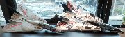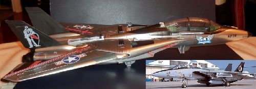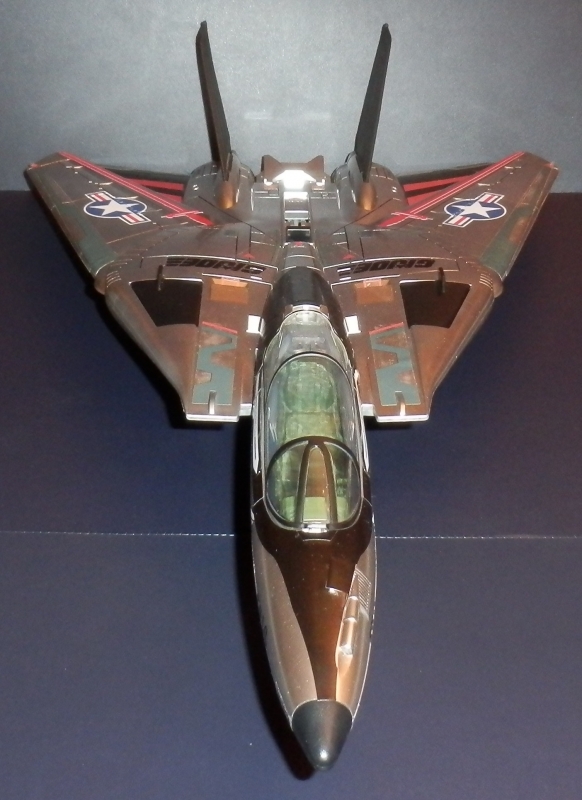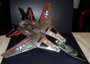 It seems like I'm collecting more and more Skystrikers these days! I was inspired by the silver paint of the Sky Patrol Skystriker to decorate it as a homage to the VF-154 Black Knights, with the shiny silver evoking thoughts of metal armor. I purchased some custom length sword decals in red to match the red-on-black theme of the Black Kinghts' emblem, and finished the look off with silver and gray Silent Strike stickers on the tailfins, wings and the top of the intakes for a geometric look.