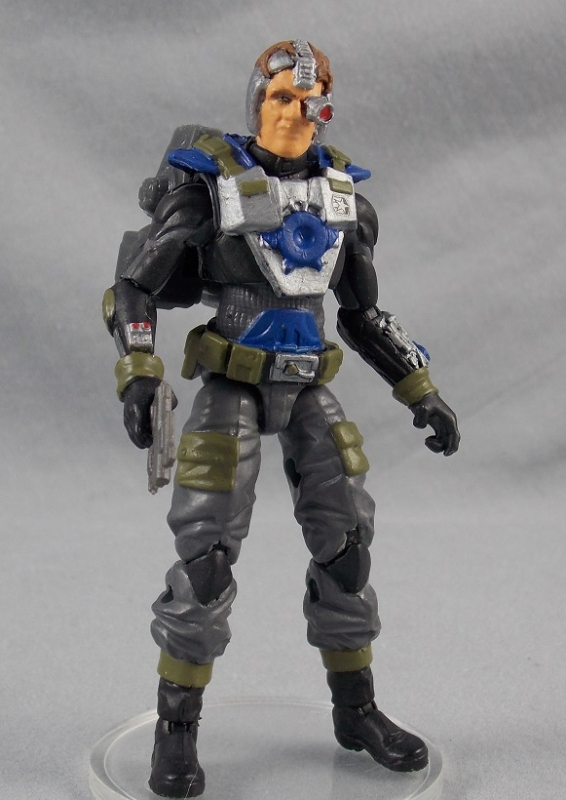 I built the figure first, the head came later on. I used a 50th Hit N Run head due to the lack of hair and wanting to try sculpting some, and for the scowl, as I wanted to convey the anger in him. I cut up a lot of random kibble to make the electronics on his face. For the hair, I used some green stuff. His color scheme is meant to mimic Wet Suit from the original Mission Brazil.