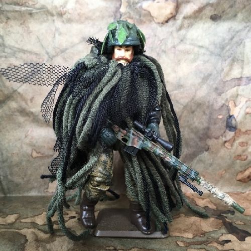 Ghillie suit: Wool and cotton thread, fishing net (used in aquariums)