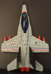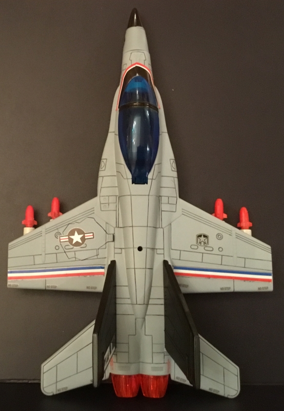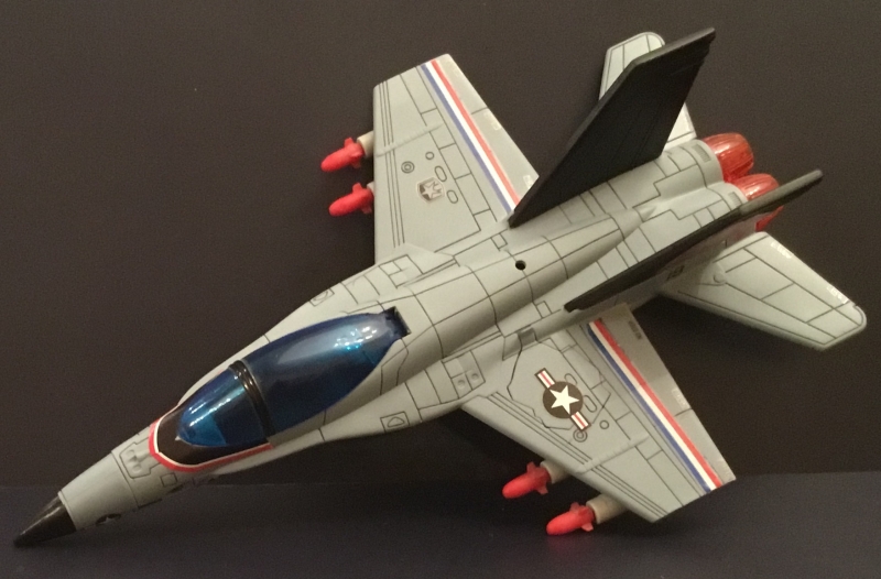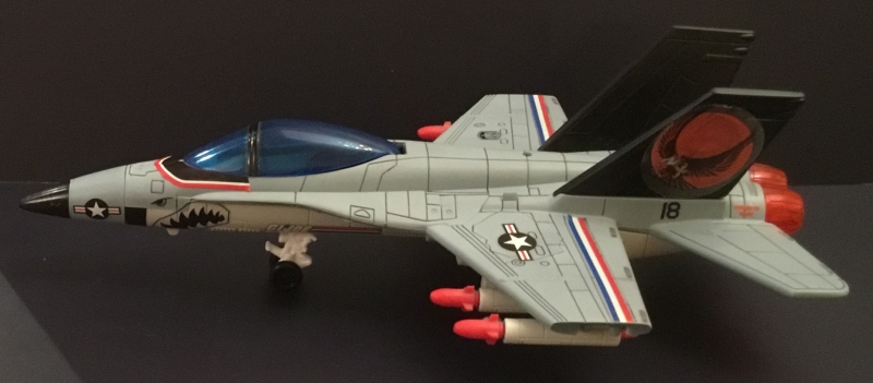 The Trendmasters F/A-18 Hornet is a nice little jet, but the green camo and long black nose cone has always struck me as being a bit goofy. So I acquired one, and took it apart, painting the top half of the jet in the more traditional gray color. I also painted part of the nose cone the same color so it would appear shorter.