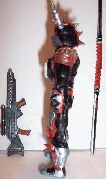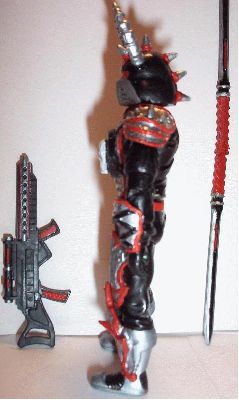 Definitely my most modified figure to date. I made some mistakes along the way, but it turned out better than I expected. The helmet design is based on an actual helmet that I made out of paper mache way back in high school. The swords can come apart, and are only held together by a piece of a sewing needle stabbed through the connecting piece. I wish I could have thought of something better than that.