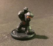 The ball joint was cut off of the head, with the head being glued to the torso. The armor plate on the forehead is cut from the NS Slice belt. The gap between the torso and waist was filled with epoxy and smoothed. The chest plate and its strap are sculpted. A backpack peg hole was drilled into the shoulder blades.