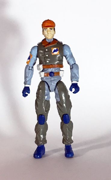 Based on the Palitoy figure, adapted to the uniform design of the Cobra Commander short jacket and the Barrel Roll flight suit legs. The biggest difference is that the white is used an accent color instead of on the sleeves. This helps create the appearance that Skyraider is wearing some kind of space flight suit. I also used a darker orange than the pure orange I used for my Moondancer custom, to fit better with the pewter grey of the vest and chaps.
