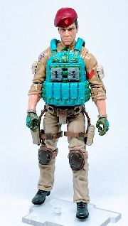 In one of the forums, I was asked who my favorite Joe character was ('83 Airborne) and was challenged to do sort of an Ultimate version of the character. I accepted and got down to thinking about what I wanted to do with this figure. To the best of my knowledge, Airborne is the first Native American Joe. In honor of that, I wanted to display his Native American heritage, but in a slightly less stereotypical way than was done with the original Spirit. I settled on the idea war paint. I did do a little bit of research regarding war paint, and, while the pattern I settled on is not specifically Navajo, it is Native American. Of course I wanted to keep Airborne's iconic blue vest as that was the thing that initially drew me to the figure and, arguably, is his most defining aspect. I figured the MTF Utility Vest was most accurate vest for a modern assault troop. Now, the MTF Contract pants are a bit of a compromise. I really would prefer some trousers that would cinch more at the boot, I really didn't want to use the regular MTF Trooper legs with the full boots showing. And I figured the MTF Drop-Down holster could approximate the look of the rappelling harness of the original Airborne. I like the MTF "Ira" style head, but MAN that head has a sourpuss expression!