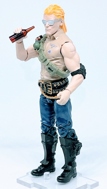 I saw this Buzzer head digital preview a few months ago on eBay and bought it on a lark to see what the actual product looked like. I did not really ever intend on using it. The head is not bad, but I think the hair is too bouffant and the face is too symmetrical to be a Dreadnok. This head should be much uglier. Buzzer's shirt is a cast-off from months ago. I had needed the dress shirt arms to finish a previous Dial-Tone custom. The dress shirt torso was really the starting point for this custom, even more so than the actual head, but for the life of me, I had no idea how I was going to give him the bare arms that he needs (it is maddeningly hard to get champagne or pale peach BFS arms these days). I got the idea to temporarily take the arms from an Eagle Force figure. I figured I could always give the arms back once the Marauders Viet Nam figures are released. After getting the arms on, the dress shirt looked a little too pristine, so I cut out some tiny notches into the arm wells to emulate ripped sleeves. I did not want to overdo it, though. Being a temporary fix, I was not prepared to paint over the Eagle Force arms. That forced me to try to paint the face and neck to match, but, dang, those arms are pale! Like almost sand white. As a result, Buzzer is not quite the sun-dried Aussie you might expect. His hair is super yellow, but I figured what the hell.