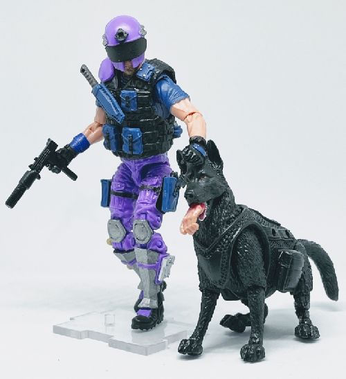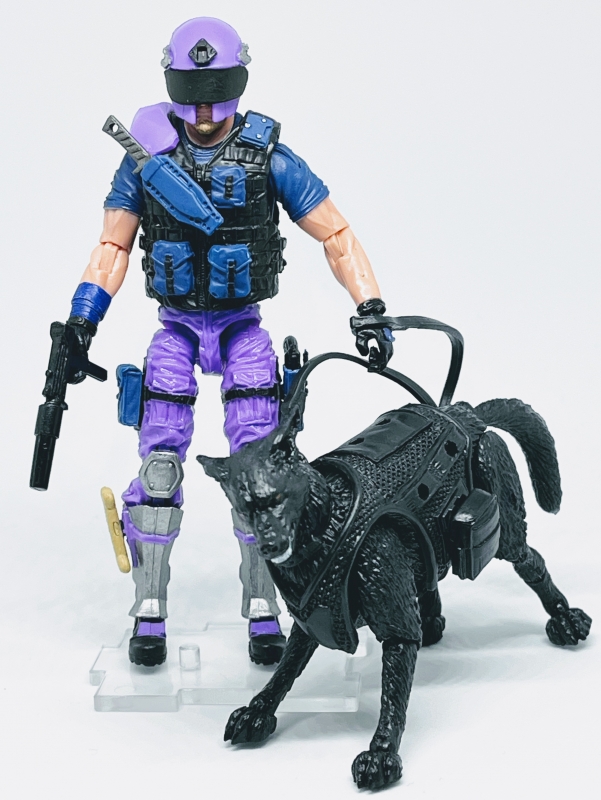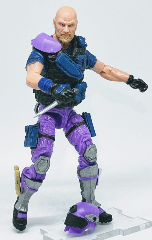 Okay, so there are a few items of note that keep this figure from being the run-of-the-mill Marauders kitbash. I wanted a more distinct helmet silhouette this time, so I took a leftover Riot helmet visor and glued it to a purple Tactical Helmet (not a big fan of the Tactical Helmet, but I knew I had one in purple and I figured what the hey). I also accidentally broke off a Bare Hand when I was doing another custom a few months ago. It was not a big deal as I have a ton of bare hands, but I kept the broken hand for whatever reason. I decided I would use it for this figure since the dog is meant to be a Cobra dog and therefore savage and murderous. I decided I would place the dog bone on the figure somewhere just to be goofy, but if you look closely you will notice that did not just glue the bone to the leg. Yep! I also keep any pegs that I slice off of pockets and pouches! You literally never know. So the bone is removable. And if you zoom in close to the figures face, you just may notice that I painted a small pink scar running down his right eyebrow and cheek. I gave the Dog Handler a MAC-10 just to resemble Mutt a bit.