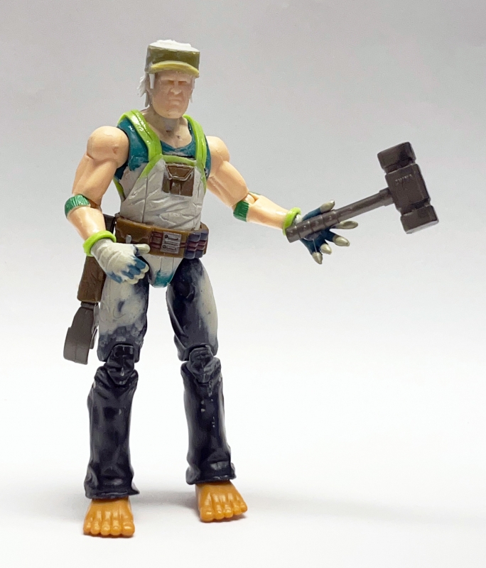 The head is cast. The hair, overalls, and gloves are sculpted, with some extra mass added to the upper legs.