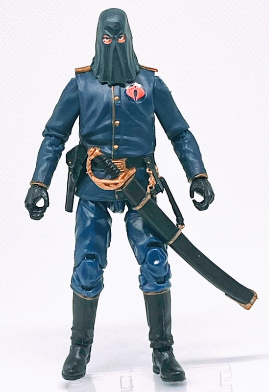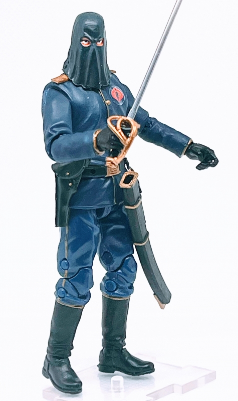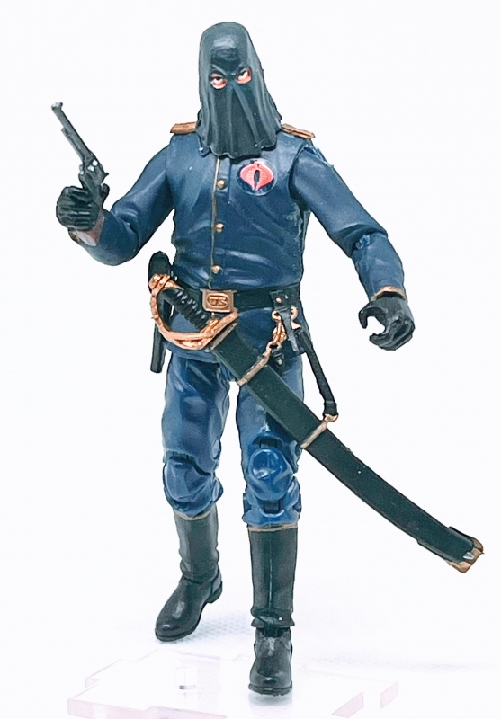 Well, I found some. Chicken Fried Toys "Dime Novel Legends" action figures are top-notch Cowboy themed figures. They recently released some Fort Laramie type Cavalry figures. One of those figures was a Cavalry Lieutenant who wears a blue short-coat that incorporates a ceremonial cutlass or rapier with a sheath and a pistol holster. As soon as I saw that figure, I knew I wanted to use it for my Hooded Cobra Commander (Grow a pair, Hasbro!) I coupled the Lieutenant torso with some WWII German waist/legs and he looked pretty good if a little monochromatic. To alleviate that, I painted some gold accents on his coat, cuffs, boot-tops and along his trousers. I also gave CC some gold epaulettes and slapped a small Cobra sticker on his chest.