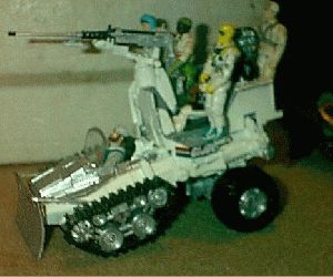 Cobra Paralizer, back half and rear wheels of the Desert Scorpion, main gun from a 12 incher, the blade is a Bivi cot, the windshield is out of a VCR tape