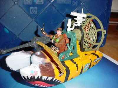 An example of OTS (Off the Shelf) procurement. A Florida company developed and produced these small air boats to market to the Coast Guard and Homeland Defense (as yet unsuccessfully). Mounting an OTO Mallerno 30mm auto cannon firing a mix of HE and AP rounds, this swift and agile craft can put down a lot of hurt in a hurry. Sporting Tiger force colors, Wild Bill takes her out on her maiden voyage as a reserve force for Beachhead's mission. The problem with OTS procurement is that the bad guys can buy them also. There are reports that Cobra, and/or the Dreadnoks may have purchased some of these air boats too.