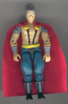 His cape is removable. It attaches to the two yellow circles on his chest. The two circles were from two yellow Lego pieces and I just cut off the circles and added them to his chest.