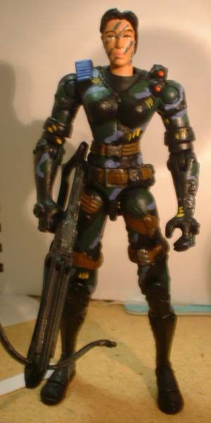 The cammo is a black base with green stripes, edged in blue-grey. The yellow '" are based on a WWII German cammo pattern, but very loosley interpreted, just to add some colour. The pattern on her face is green mixed with blue-grey, as after looking at her, her face seemed really 'bright', so it needed darkening down.