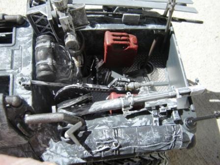 I added a digital camo paint job and loaded the back down with an extra gas tanks on both sides of the bed, two rocket launchers, a ski rack mounted on the right rear quarter panel which is made from a Snow Job v.1 backpack, skis and ski poles (of course) packs on the left rear quarter panel and on the back of the cab and a 50 cal Barret sniper rifle. I also used a Hardball v.1 backback and mounted it to the hood and added a take-down light using the flash light that came with Wet Suit v.2