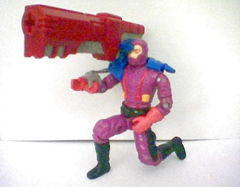 The idea for this figure came about when I was trying to find uses for all those extra spring-loaded missile launchers from the Battle Corps series that I had, and using Snow Serpent v2's missile launcher/backpack, I made up this figure from purple parts from extra complete figures that I had at the time.