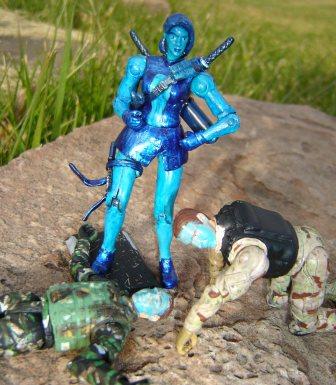 Using already captured DNA from the G.I. Joe member Scarlett, Dr. Mindbender created his most lethal clone yet. In fact several of his staff were killed during her creation. Cyanotica's body uses oxygen at a much lower rate than everyone else's; as a result her body has a blue tint known as cyanosis. Her body has the ability to steal oxygen from the air around her. She is very fond of using her powers as well as her fighting ability that was transferred through the DNA. Just ask Dr. Mindbender's staff!