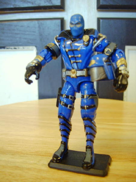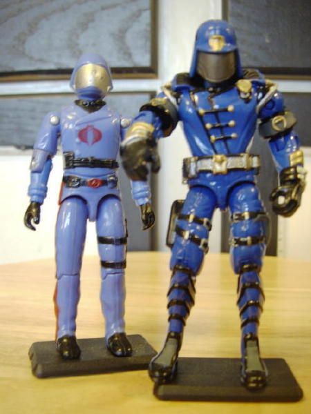 Who has not done this custom? This new mold for the Cobra Commander is perfect in my opinion. A lot of the details I wanted to capture were already provided. It is an awesome mold. I did not want to change much at all. I was even contemplating on keeping the hooded head on, but decided that a glass shield helmet would be classified as a custom instead of a repaint. Another idea of mine was to use Scapel's lower legs for my Commander, but he looked way too laid back. I wanted a hard core commander (if you will), because in my imagination, to be a commander of anything, you can't be a punk. So, there's not much to this custom at all. A very simple custom to do and a lot of fun. Thanks for looking.