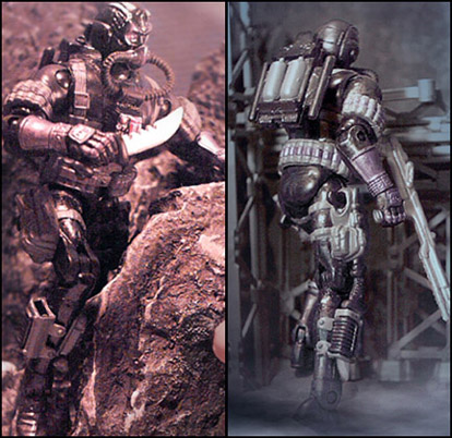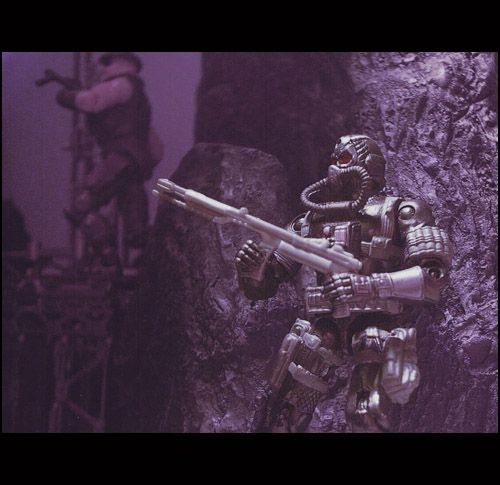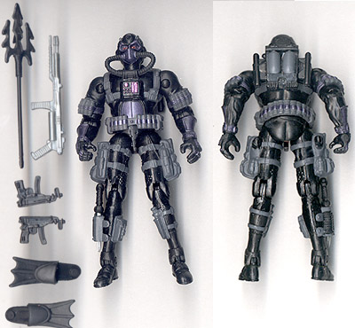 The Joe vs. Cobra Moray is one of my favorite Hasbro sculpts. Its only flaw is the limited articulation of the t-crotch design. Unlike the later Valor vs. Venom Electric Eel (which suffered from some very odd proportions), the Moray looked fierce and slightly futuristic, but still within the realms of a plausible soldier. It was a style worthy of the highly skilled, threatening character the Eels was originally intended to be. Even though the costume and colors weren't an homage to the original Eels, the Moray seemed like a superior update to the vintage figure. Given its easy availability, it became the mainstay of my Cobra naval forces. This custom came about while I was experimenting with parts to make the figure match the rest of the o-ringed ranks. I tried to retain the best elements of the Moray, and augment them with other complimentary parts. The new legs and attached gear make him looked well equipped for a variety of missions, without sacrificing articulation. The added ankle joints even allow him a greater variety of poses, including more realistic positions for his feet while swimming.
