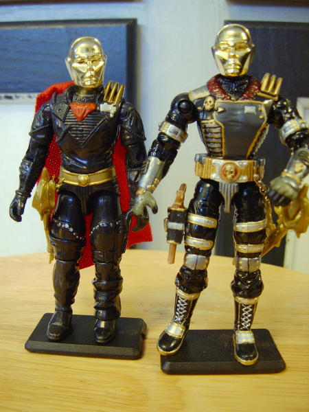 Destro is A custom that I've been wanting to do since I started the hobby. I wanted my skills to reach A certain peak before I began constructing Ideas for the character. The fist two ideas I came up with was to find resembling pieces to match the originals waist and chest as A foundation. Next I began struggling with Ideas for A head. Every Idea I thought of was far from original. I wanted an "all me" idea. So I hollowed out the original Destro head and made it fit an Iron Grenadier head just for irony. The Black Out legs are self explanatory , should have been Destro's from the jump. The arms were the last thing I did besides all the little details. I was extremely picky with arm selection. I wanted all pieces to be uniform with each other. Behold Destro! Thanks to the whole Joecustoms staff , and everyone else Thank you for looking.