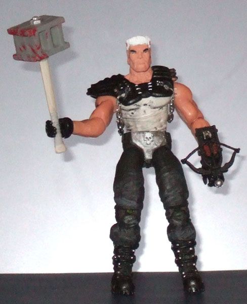 I thought the old Road Pig was kind of goofy looking but I like the idea of a Dreadnok that's just muscle. The cinder-block-on-an- axe handle is also an awesome weapon. I remember seeing a Road Pig made from the Ven Max head so I thought I'd try it. I attached the legs with green stuff. The shoulder pads are what I'm most proud of. The chains are from a dollar store chain. They detach using clasps. The reason they detach in the first place is because the shoulder pads come off or slide around otherwise.
