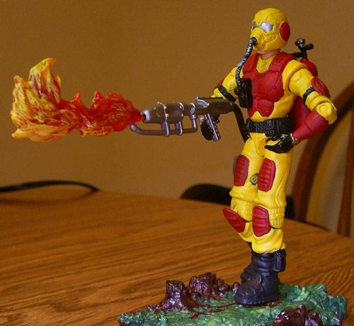I never had a Blowtorch figure as a kid, but I really liked him. I got one of the new sculpt Blowtorch figures and was impressed by the mold, but wanted him to have his old color scheme. That's about all there is to this figure. The yellow and red isn't very realistic military, but it does seem like it would be good camoflauge in the middle of an inferno. The only other change of note was the use of Torch's fuel tanks and flamethrower. I like the little things about it, like the regulator and the ignitor flame piece. I painted the fire so that it would look to have a bit more depth with mixed feelings about the outcome.