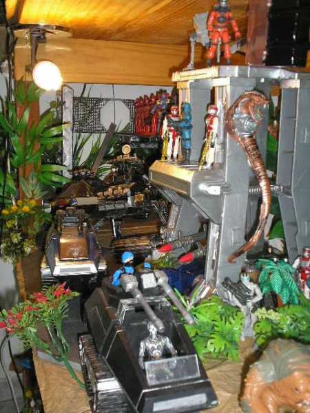 2 modified Hiss 1, modified Hiss 2, modified Demon, Cobra Adder, capsule from Vector Jet, aluminum painted tower from Price, self-made facility with two floors, parking space surrounded by brick wall, 5 die-cast cars scale 1:18, several structures made from different plastic parts, artificial plants, several robot figures as well as 81 figures from Hasbro, Lanard, Chap-Mei and others