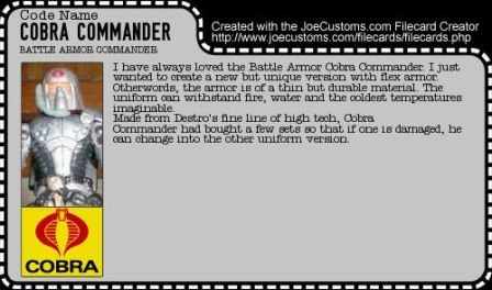 I have always loved the Battle Armor Cobra Commander. I just wanted to create a new but unique version with flex armor. Otherwords, the armor is of a thin but durable material. The uniform can withstand fire, water and the coldest temperatures imaginable.