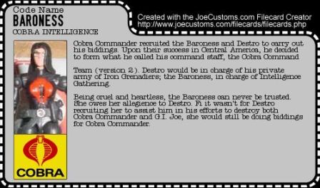 Baroness is as ruthless and untrustworthy a Cobra operative can be. She uses her abilities to intimidate prisoners into making them reveal certain intel.