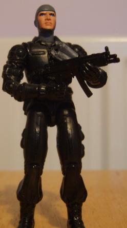 The original Eagle figure had his face covered with an assault gas mask. I wanted to create a version of the character as he appeared in the Battle Action Force comic, unmasked in a grey balaclava. When I saw the Depth Charge head, it was perfect. The rest I chose to be as plain as possible, adding the smoke grenades to give him the 'Iranian Embassy Siege' feel of the original. Since Eagle wouldn't be complete without his mask and his Heckler and Koch sub-machine gun, I was lucky when BBI came up with the goods. I haven't painted any of the team logos (bar one or two of the Red Shadows) as I'm not very good at it; when I am, I may well revisit the whole set.