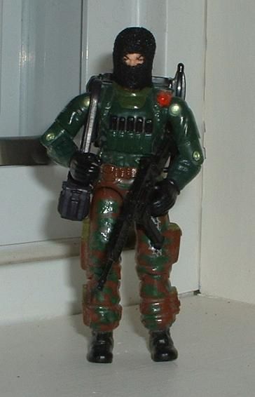 The pants on this version seem to be borrowed from the Funskool version, right down to the odd blue-ish green camo pattern. That didn't work for me, so I mixed some paints to match the green of the figure's shirt, and painted over the camo with it.